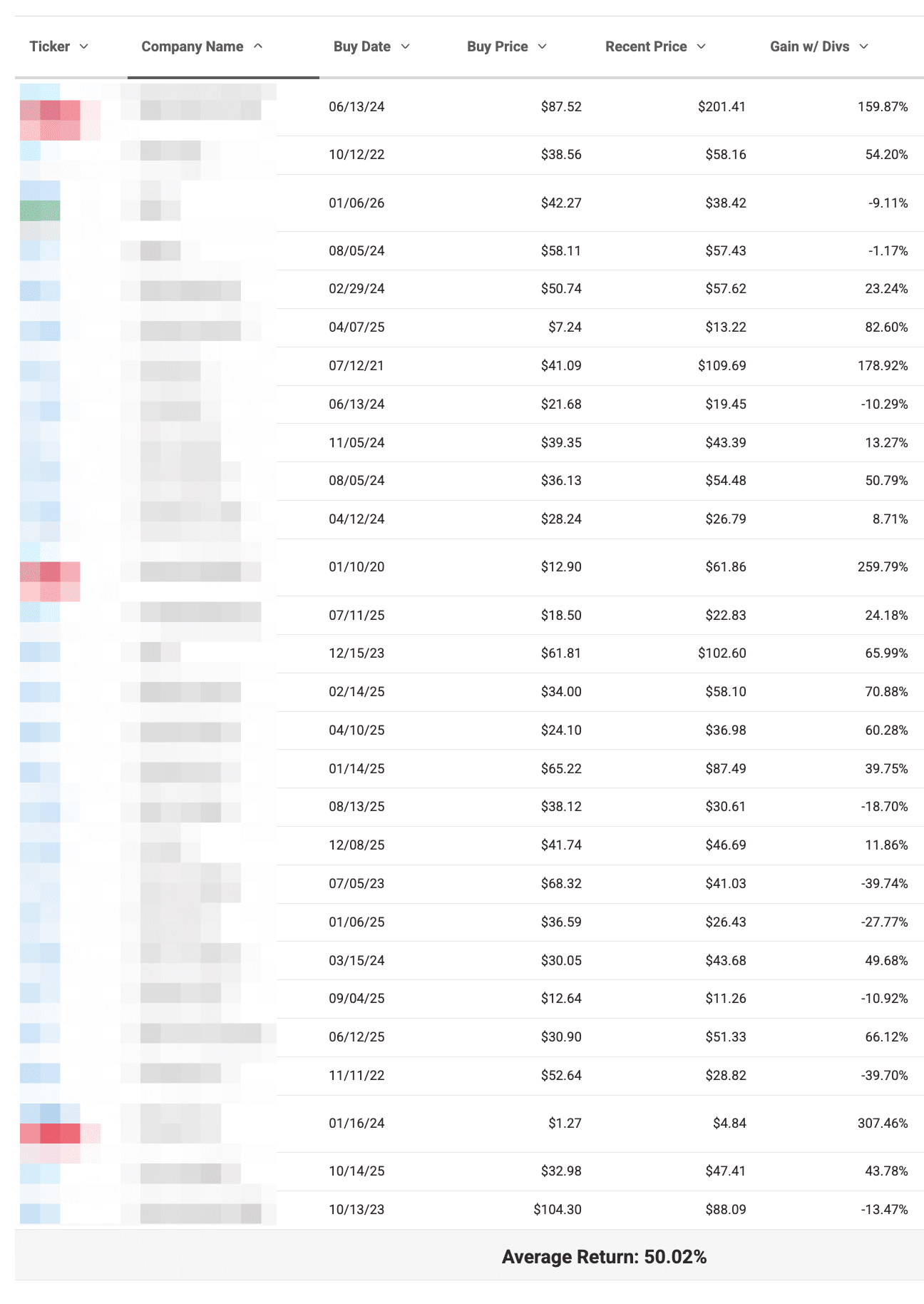 As of writing (Feb 2026), the “open” portfolio contains over two dozen picks with an average return of about 50%, with a fairly wide spread between winners and losers: