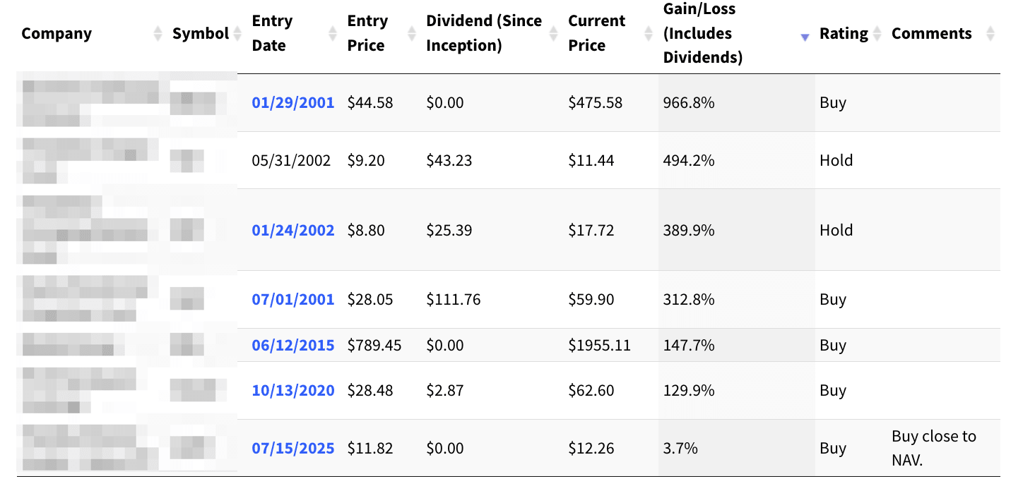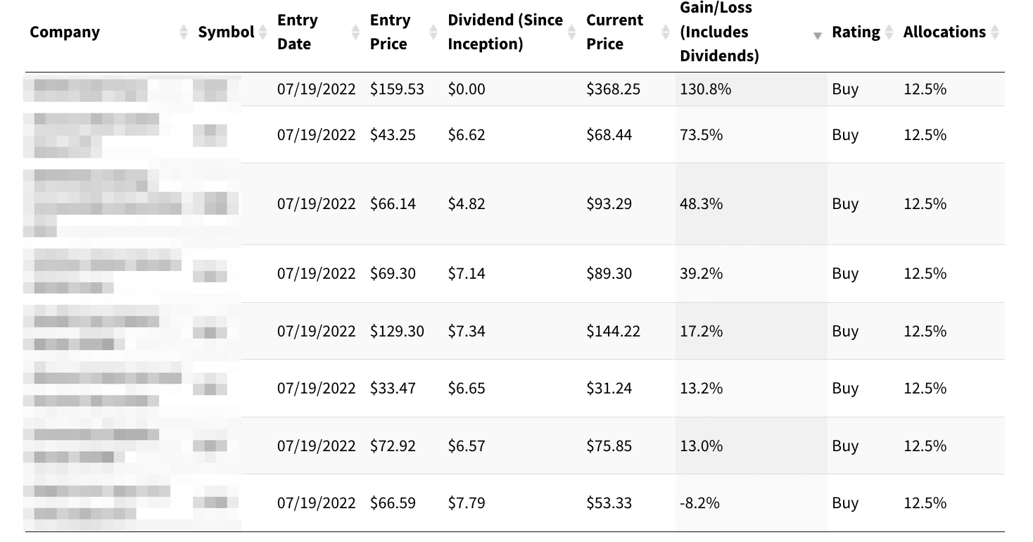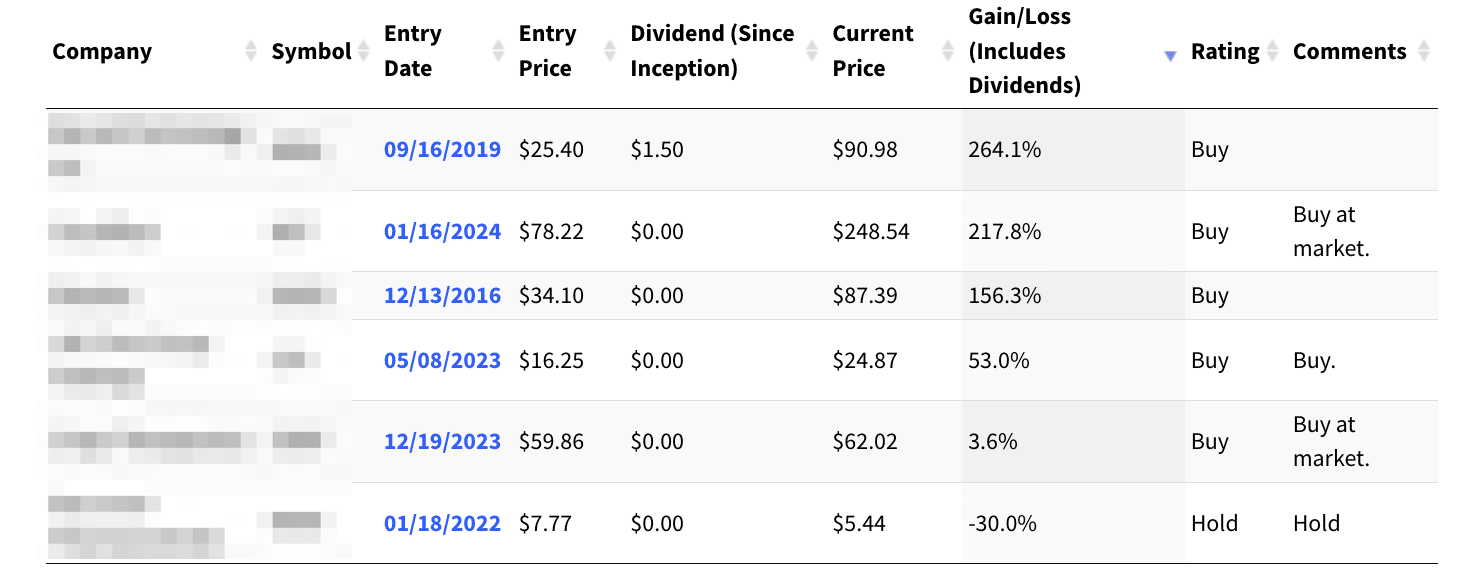 This is Alex Green’s flagship model portfolio, a list of what he considers the market’s best current opportunities. It’s mostly focused on mid- to large-cap U.S. companies with solid balance sheets and clear growth drivers (names and tickers blurred because it’s a paid service).
